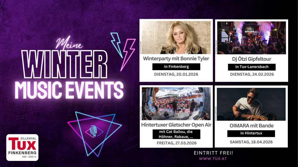 Die Wintersaison 2026 in Tux-Finkenberg verspricht nicht nur erstklassigen Wintersport, sondern auch unvergessliche musikalische Erlebnisse. Mit einer einzigartigen Mischung aus winterlicher Atmosphäre und hochkarätigen Live-Acts werden die Winter Music Events auch heuer wieder zu einem Muss für alle Musik- und Schnee-Enthusiasten. Der Eintritt zu allen Veranstaltungen ist wie immer frei.