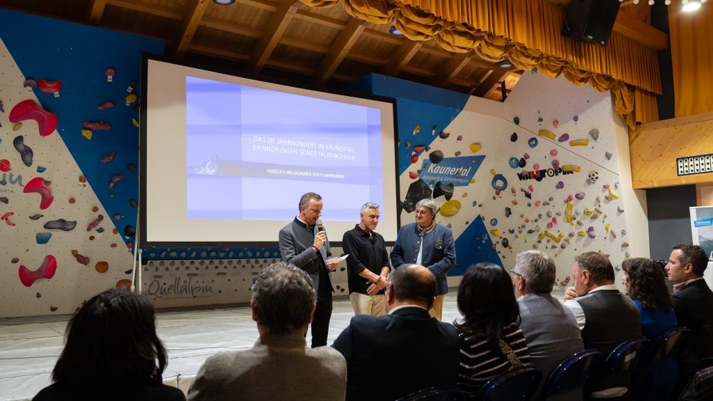 Bilddaten Bildtitel: GF Dietmar Walser, Bürgermeister Christian Kalsberger & Filmemacher Thomas Junker freuten sich über ein volles Haus Bildnummer: 280848 Copyright: © TVB-Tiroler-Oberland-Erlebnisraum-Kaunertal-Annalena-Walch
