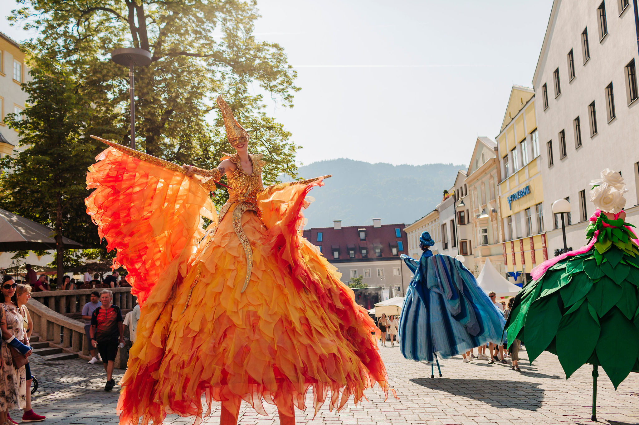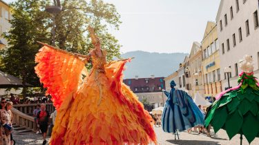 Abseits der großen Bühnen bietet KUFSTEIN unlimited auch heuer wieder ein abwechslungsreiches Programm für Familien und Liebhaber:innen der Straßenkunst. Wenn Farben lebendig werden, Papageien flirten und Bäume plötzlich zurück umarmen, dann sind die fantasievollen Walking-Acts nicht weit: Mit Colors verwandeln prachtvoll kostümierte Figuren das Veranstaltungsgelände in ein wirbelndes Farbenmeer. Die stolzen Pappagalli begeistern mit imposantem Federkleid und charmant-frechem Temperament. Für staunende Momente sorgen die Living Trees, die als lebende Bäume durch die Stadt laufen. Humorvoll wird es mit drei liebenswerten Köchen, die mit Witz und Charme für beste Stimmung im Publikum sorgen.