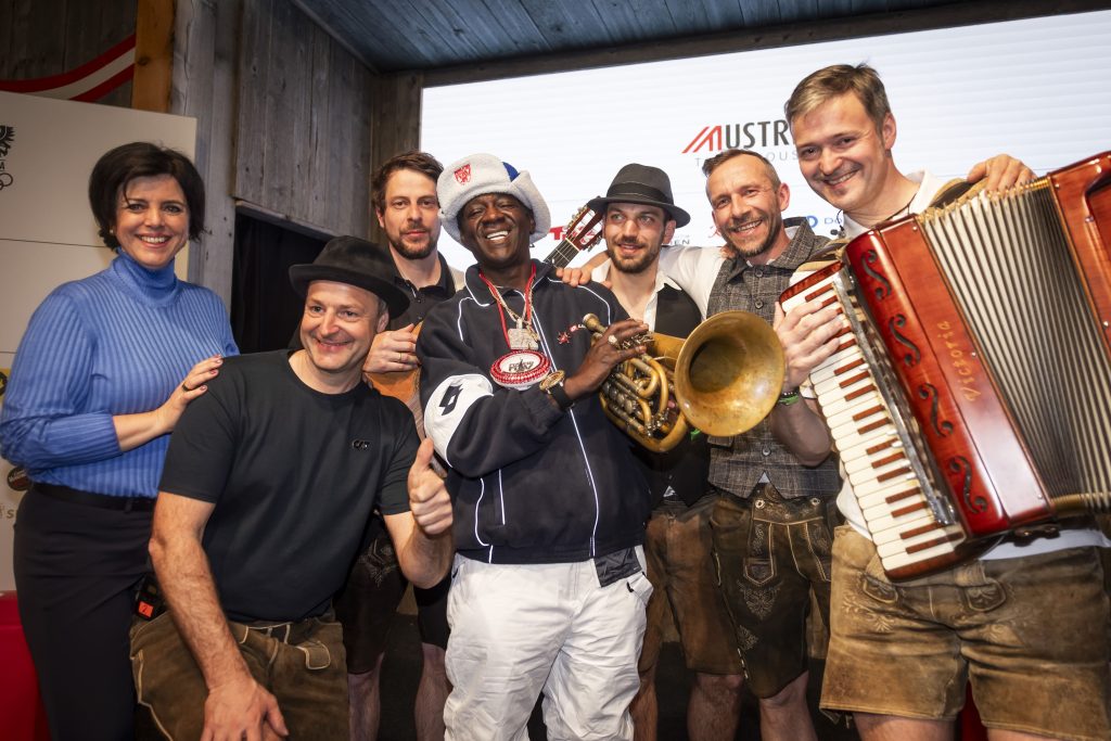 Star des Abends war US-Star-Rapper Flavor Flav (M.), der mit seinem Auftritt das Austria Tirol House begeisterte (im Bild mit Tirol-Werbung-Geschäftsführerin Karin Seiler und der Band Tyrol Music Project).